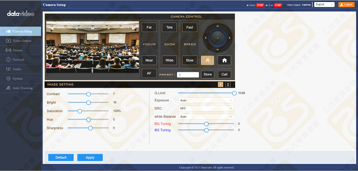 可透過 Datavideo SHOWCAST 100, 雲台攝影機操作助理 PTZ View Assist、RMC-300A、RMC-180 控制器,控制雲台攝影機上下左右旋轉與變焦。可支援自定義預設位置。