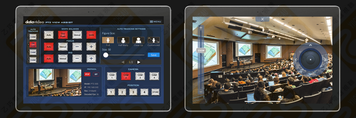 「雲台攝影機操作助理」是一件專為 Datavdieo 雲台攝影機系列量身定制的應用程 式。該應用程式可監看 PTC-140, PTC-145, PTC-280, PTC-285, PTC-300, PTC-305和PTC-325 雲台攝影機的實況影像, 並透過 DVIP 控制協議同時控制四台雲台攝影機。此應用程式也可以設定和呼叫預設指令、調整白平衡、對焦和光圈。「雲台攝影機操作助理」將能透過 RTSP、SRT 和 NDI,對直播影像進行解碼,讓使用者可以在同一應用程式中輕鬆監看直播影片,並且迅速設定應用參數。