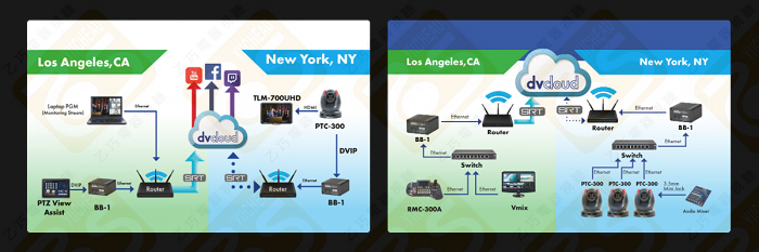 當影像串流到達dvCloud後,再使用dvCloud可靠的高頻寬網路,將影像串流到指定目的地,如Facebook和YouTube。