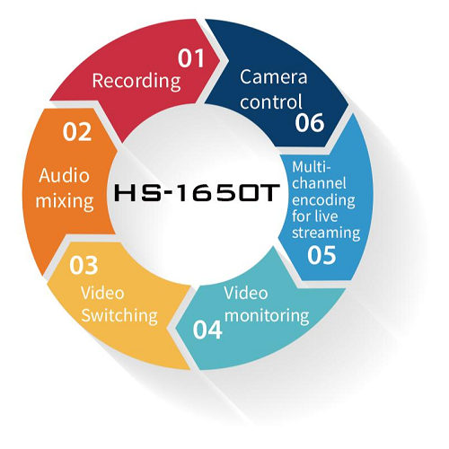 HS-1650T 將六大強大製播功能 — 切換、串流、錄影、聲音混音、監看與攝影機控制 — 完整整合於堅固可攜的機身中。