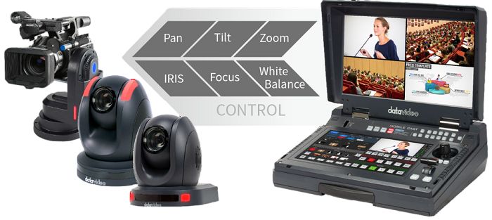 HS-1650T 具備內建 PTZ 攝影機控制系統,可同時操作最多三台 Datavideo PTZ 攝影機。