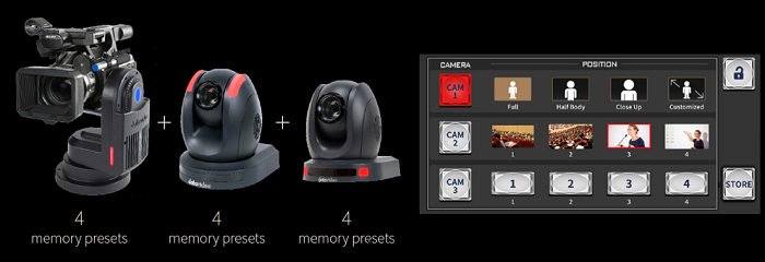 可同時控制最多 3 台 Datavideo PTZ 攝影機,每台可設定 4 組預設位置,總共支援 12 組記憶預設。