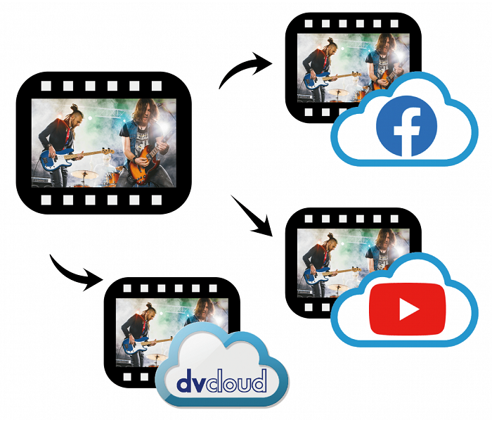 當影像串流到達dvCloud後,再使用dvCloud可靠的高頻寬網路,將影像串流到指定目的地,如Facebook和YouTube
