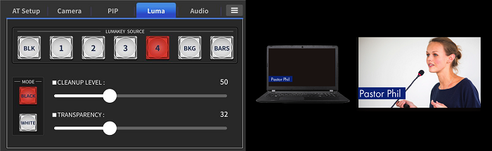 HS-1650T 具備內建的字幕與 Logo 疊加功能。只需連接外部筆記型電腦,使用者即可在直播製作過程中輕鬆輸入並顯示自訂文字標題與圖像 Logo。