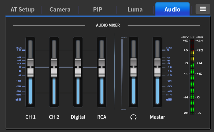 HS-1650T 內建聲音混音器,可在影像製作過程中即時調整與混音多達四個聲音輸入通道,將聲音與影像處理整合於一套系統中,大幅簡化您的製作流程。