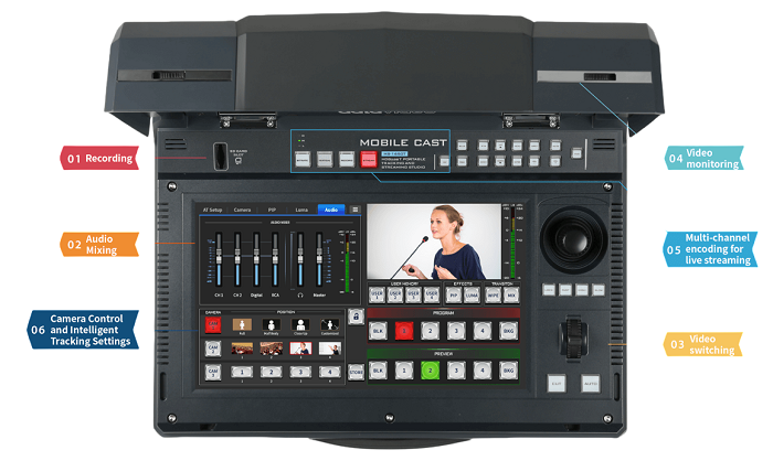 整合了影像切換、串流、錄影、攝影機控制與音訊混音等功能於一台裝置中。